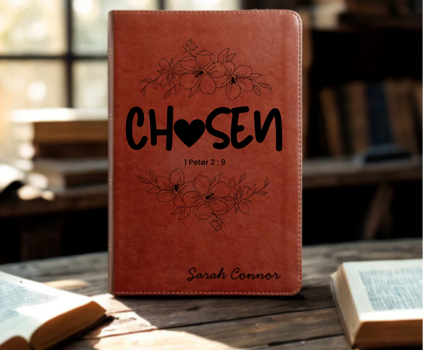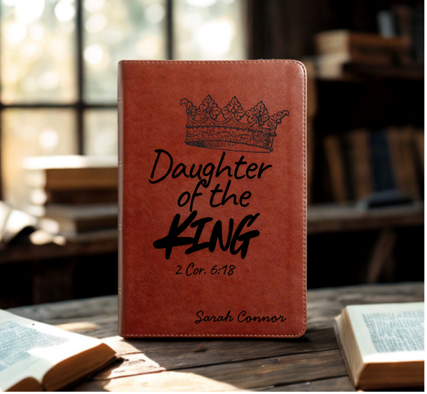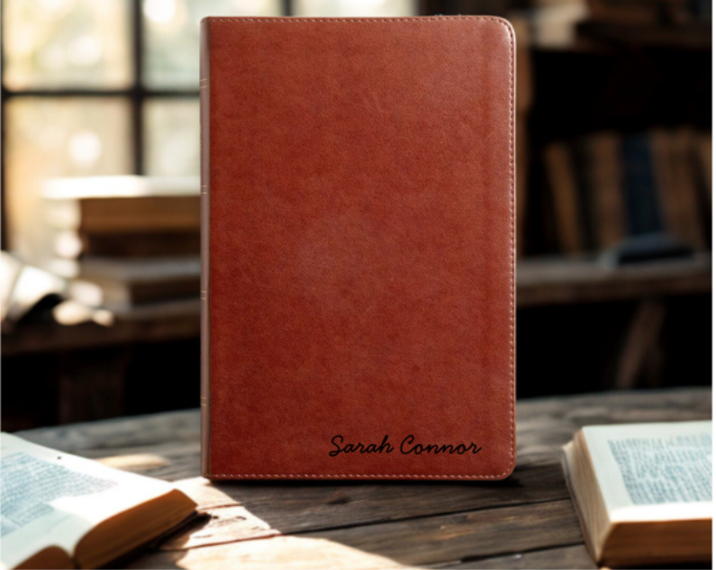 Click HereHave a name elegantly engraved in cursive on the bottom-right corner of the Bible of your choice.